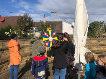 Wir haben das gerne zugesagt und uns am Sonntag (5.10.2025) mit Spielen, Holzbaustäben, Glücksrad und kleinen Preisen auf den Weg gemacht. Auf der Wiese vor dem Pavillon herrschte buntes Treiben und in kürzester Zeit bildete sich vor dem Glücksrad bereits eine längere Schlange.